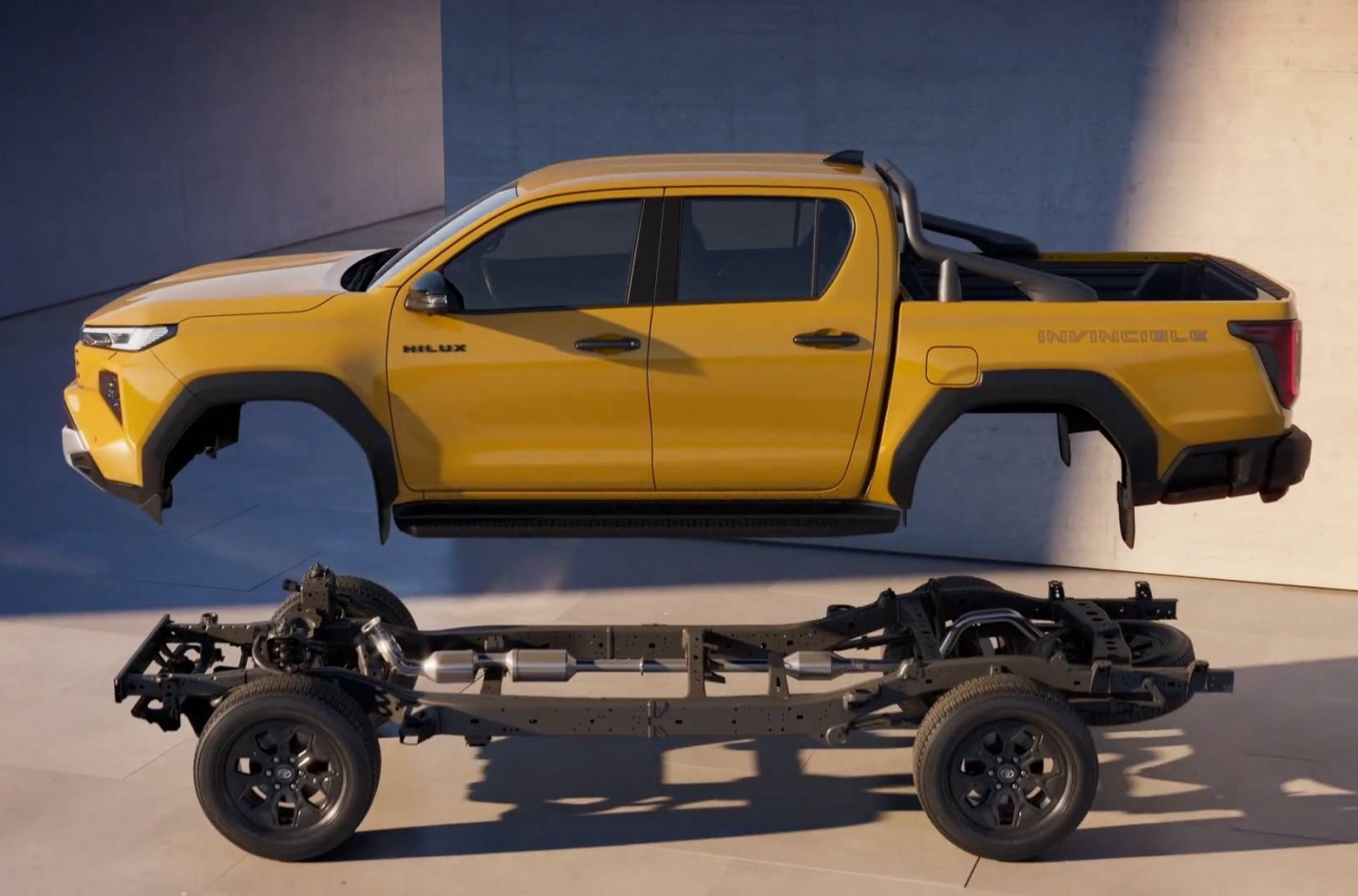 Hilux tvirta rėminė kėbulo konstrukcija yra pagrindinis jo patvarumo garantas. Hibridinės sistemos 48 V ličio jonų akumuliatorius įrengtas po galinėmis sėdynėmis, todėl nemažinama salono erdvė. Kadangi hibridinės sistemos motoras-generatorius sumontuotas virš vidaus degimo variklio, tai papildomai leidžia Hilux įveikti gilias brastas.
