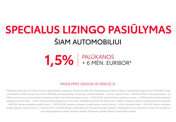 Bendros lizingo kainos metinės normos apskaičiavimo pavyzdys. Pasiūlymą teikia SIA Citadele Leasing Lietuvos filialas. Automobilio kaina 25 000 EUR, pradinė įmoka 10% (2 500 EUR), lizingo sutarties terminas – 60 mėn., likutinė vertė 35% (8 750 EUR), ridos apribojimas – 20 000 km per metus, tuomet bendra vartojimo kredito suma (finansuojama suma) – 22 500 EUR, metinė kintama palūkanų norma – 3.569 % (pastovioji palūkanų normos dalis – 1.50% + 3 mėn. EURIBOR, kuris 2025-11-15 d. buvo 2.069%), sutarties mokestis – 250 EUR, bendra vartojimo kredito kaina – 3 181.78 EUR, bendros vartojimo kredito kainos metinė norma – 4.03%, mėnesio įmoka – 278 EUR, bendra vartojimo kredito gavėjo mokama suma – 25 681.78 EUR. Sudarant lizingo sutartį gali būti numatyta pareiga sudaryti ir lizinguojamo turto draudimo sutartį. Šis pasiūlymas nėra įsipareigojimas suteikti vartojimo kreditą.