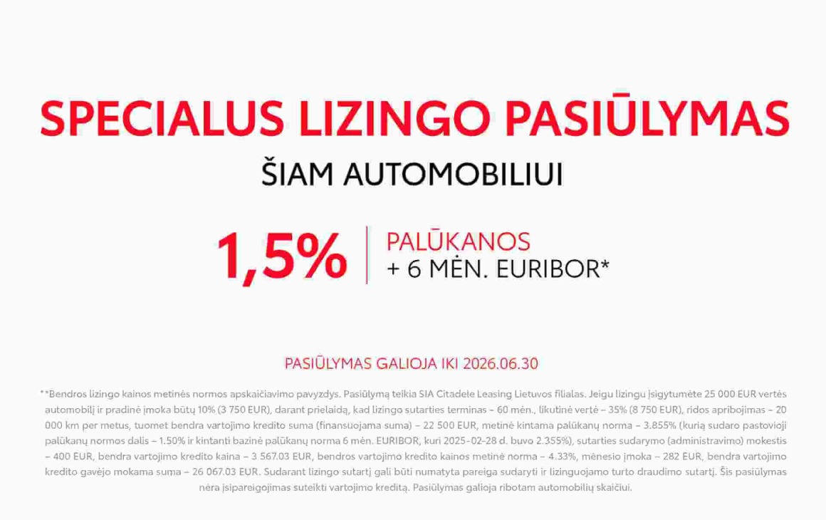 Bendros lizingo kainos metinės normos apskaičiavimo pavyzdys. Pasiūlymą teikia SIA Citadele Leasing Lietuvos filialas. Automobilio kaina 25 000 EUR, pradinė įmoka 10% (2 500 EUR), lizingo sutarties terminas – 60 mėn., likutinė vertė 35% (8 750 EUR), ridos apribojimas – 20 000 km per metus, tuomet bendra vartojimo kredito suma (finansuojama suma) – 22 500 EUR, metinė kintama palūkanų norma – 3.569 % (pastovioji palūkanų normos dalis – 1.50% + 3 mėn. EURIBOR, kuris 2025-11-15 d. buvo 2.069%), sutarties mokestis – 250 EUR, bendra vartojimo kredito kaina – 3 181.78 EUR, bendros vartojimo kredito kainos metinė norma – 4.03%, mėnesio įmoka – 278 EUR, bendra vartojimo kredito gavėjo mokama suma – 25 681.78 EUR. Sudarant lizingo sutartį gali būti numatyta pareiga sudaryti ir lizinguojamo turto draudimo sutartį. Šis pasiūlymas nėra įsipareigojimas suteikti vartojimo kreditą.