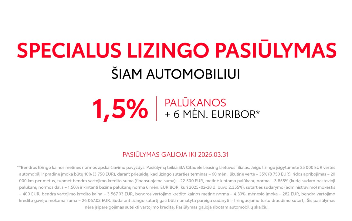 Bendros lizingo kainos metinės normos apskaičiavimo pavyzdys. Pasiūlymą teikia SIA Citadele Leasing Lietuvos filialas. Automobilio kaina 25 000 EUR, pradinė įmoka 10% (2 500 EUR), lizingo sutarties terminas – 60 mėn., likutinė vertė 35% (8 750 EUR), ridos apribojimas – 20 000 km per metus, tuomet bendra vartojimo kredito suma (finansuojama suma) – 22 500 EUR, metinė kintama palūkanų norma – 3.569 % (pastovioji palūkanų normos dalis – 1.50% + 3 mėn. EURIBOR, kuris 2025-11-15 d. buvo 2.069%), sutarties mokestis – 250 EUR, bendra vartojimo kredito kaina – 3 181.78 EUR, bendros vartojimo kredito kainos metinė norma – 4.03%, mėnesio įmoka – 278 EUR, bendra vartojimo kredito gavėjo mokama suma – 25 681.78 EUR. Sudarant lizingo sutartį gali būti numatyta pareiga sudaryti ir lizinguojamo turto draudimo sutartį. Šis pasiūlymas nėra įsipareigojimas suteikti vartojimo kreditą.